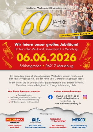 60 Jahre - wir freuen uns über starke Partner an unserer Seite. Werden Sie Sponsor unseres Jubiläums am 6. Juni und unterstützen Sie Kultur, Gemeinschaft und musikalische Tradition in unserer Region. Gemeinsam machen wir dieses Fest unvergesslich! Nähere Informationen auf dem folgenden Flyer.