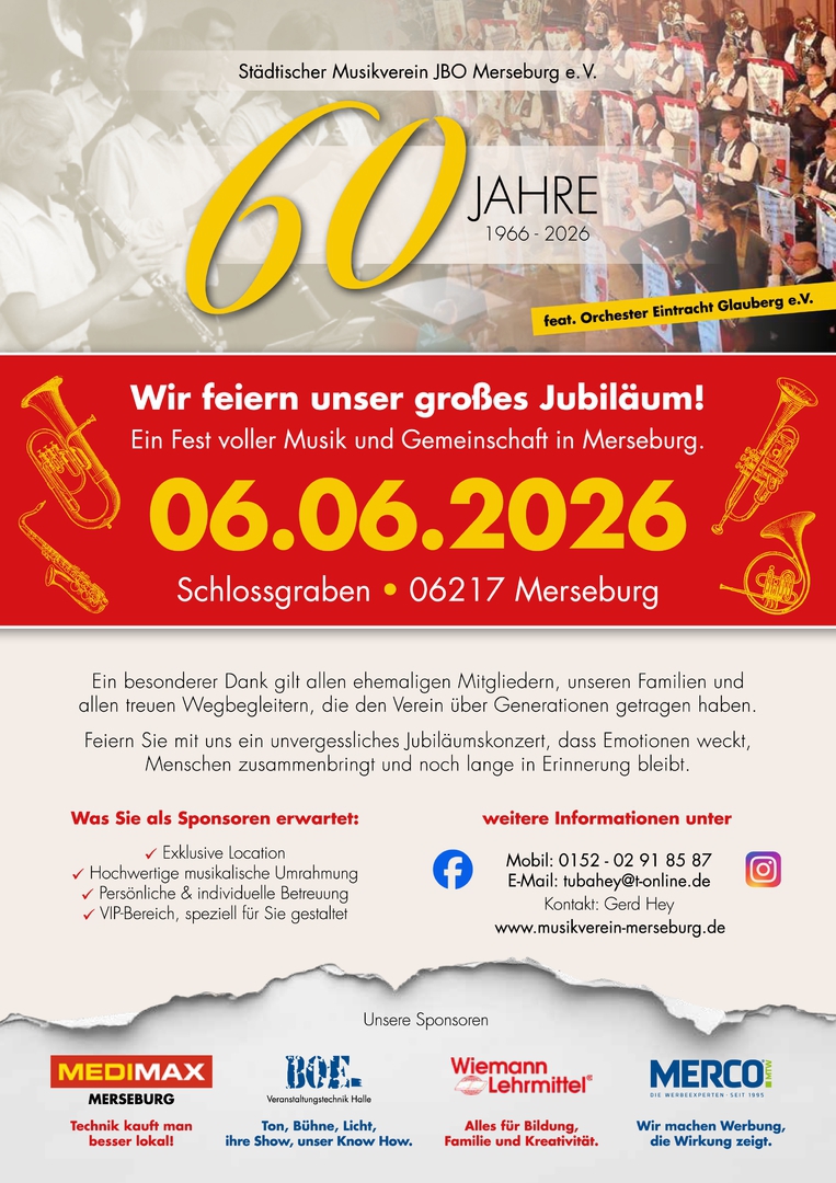 Das feiern wir gemeinsam mit euch im Schlossgraben Merseburg. Freut euch auf ein besonderes Fest voller Musik, Begegnungen und unvergesslicher Momente. Seid dabei und feiert mit uns 60 Jahre Musik und Gemeinschaft.